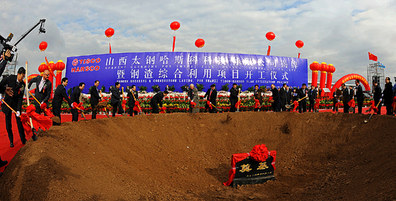 出席仪式的领导和来宾共同为太钢哈斯科钢渣综合利用项目开工奠基。
