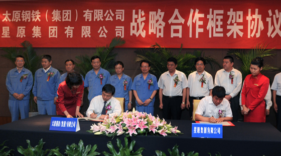 9月9日上午,太钢集团与山西襄汾星原集团钢铁及相关业务战略合作框架协议签字仪式在花园国际大酒店举行。双方将充分发挥各自优势,在钢铁、能源等领域进行合作,优势互补,合作共赢。