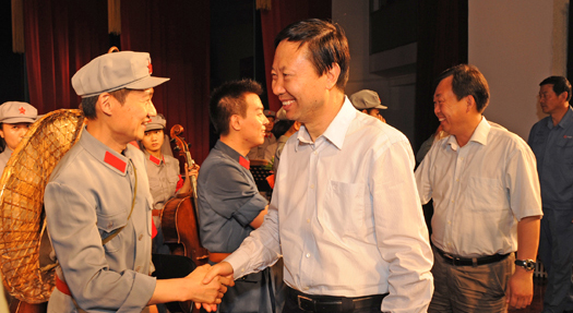 9月11日晚,在太钢工人俱乐部,北京军区战友文工团演出的《长征组歌》,让钢城职工受到了一次爱国主义教育。北京军区战友文工团副团长郭自强、山西省军区副司令员姬亚夫、山西省军区政治部主任黄献军、太原警备区司令员贠自博,以及太钢领导杨海贵、韩瑞平、王继光、柴志勇、王一德,太钢老领导梁承哲、王福艺、石双文、张明远与太钢职工一起观看了演出。