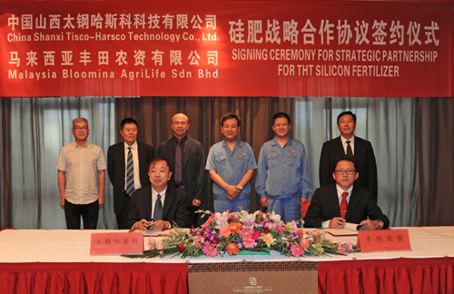 太钢哈斯科科技有限公司总经理单德钧与马来西亚丰田农资有限公司总裁阿里戈先生代表双方签署了硅肥战略合作协议。