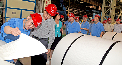 图为国务院质量工作考核组一行在不锈冷轧厂参观考察。 王旭宏 摄
