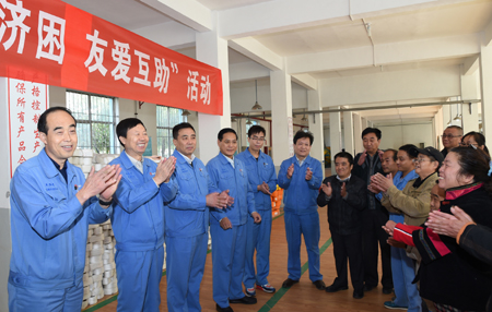 在福利总厂吊装车间,公司领导看望了正在工作的残疾职工。杨海贵强调,今天是全国第一个扶贫日。全公司职工非常关心残疾职工,我们代表全体职工来看望大家。公司早就承诺,决不允许因为困难,我们职工的子女上不起大学、职工看不起病、生活不下去。“扶贫济困友爱互助”是我们的责任,也是我们的义务。看到大家生活得幸福美满,我们非常高兴。希望大家有困难尽管提出来,组织上会帮助大家解决的。同时,也希望大家立足岗位作出更大贡献,把太钢建设得更加美好。